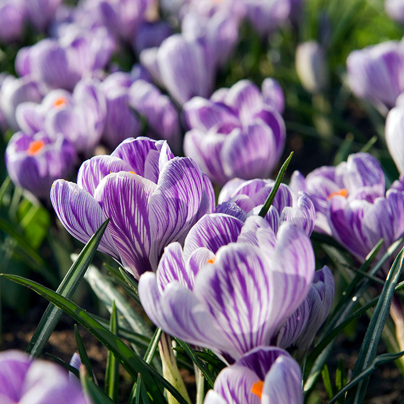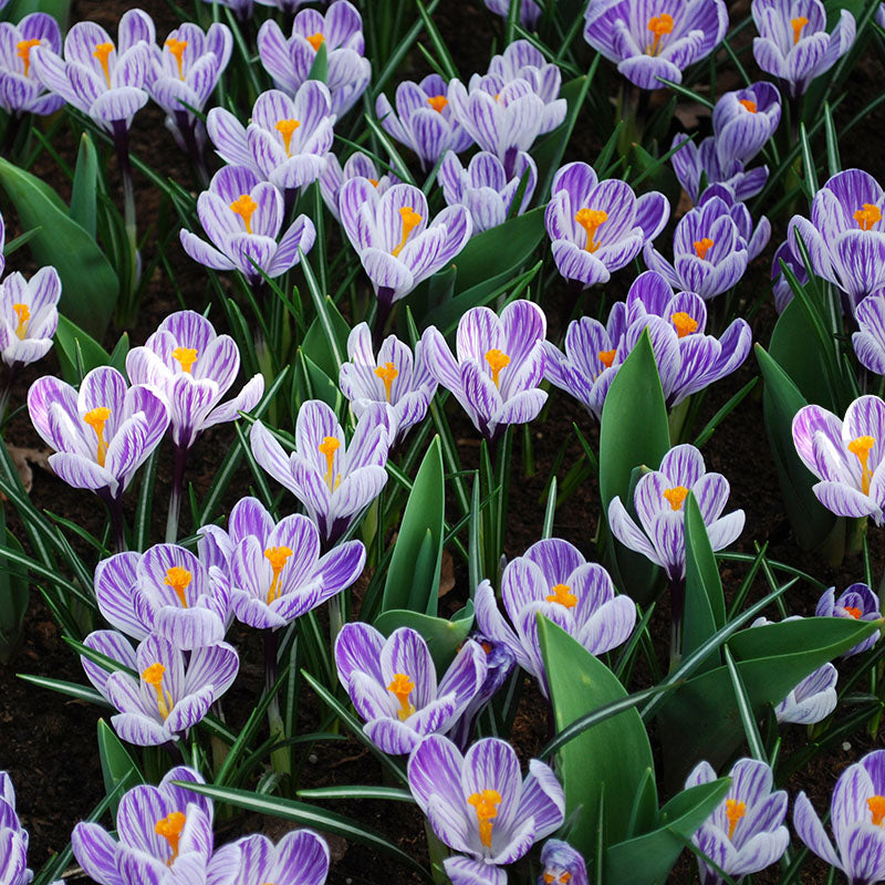 Crocus Pickwick ist einer der beliebtesten großblütigen Krokusse. Die großen violett-weiß gestreiften Blüten stehen auf etwas kürzeren Stielen und haben leuchtend orange Staubgefäße, die viele Bestäuber anlocken. Ab 3 Stück: 5,40 € pro Packung.