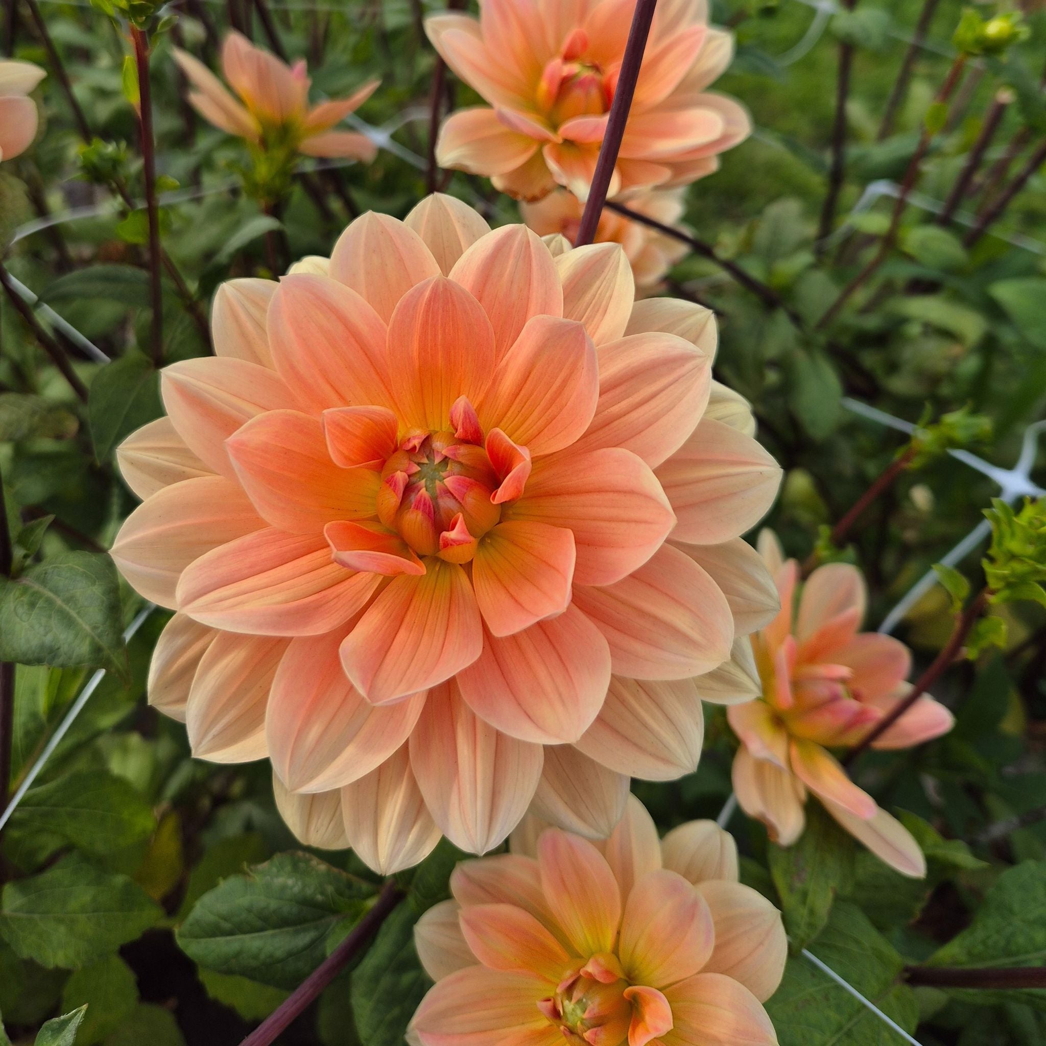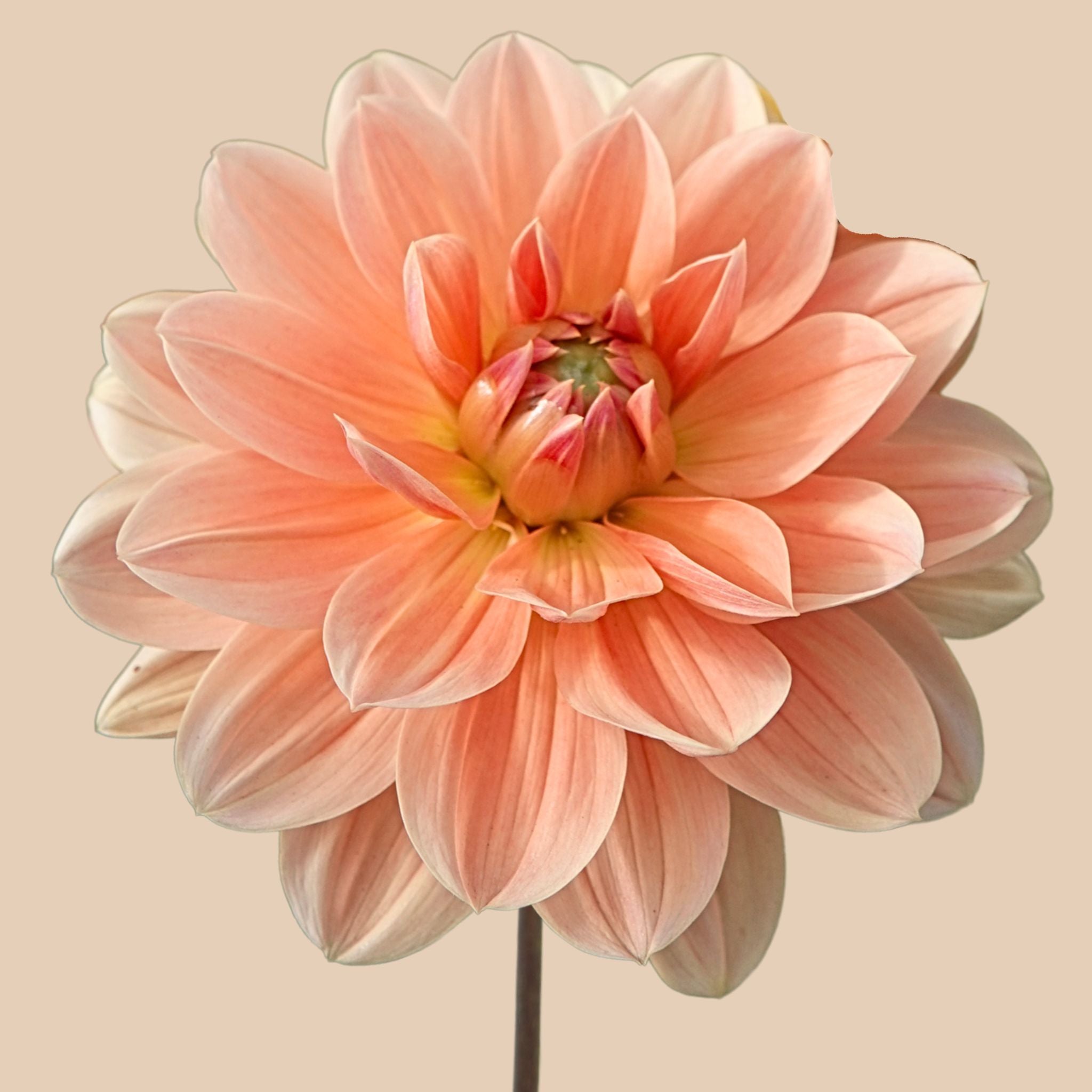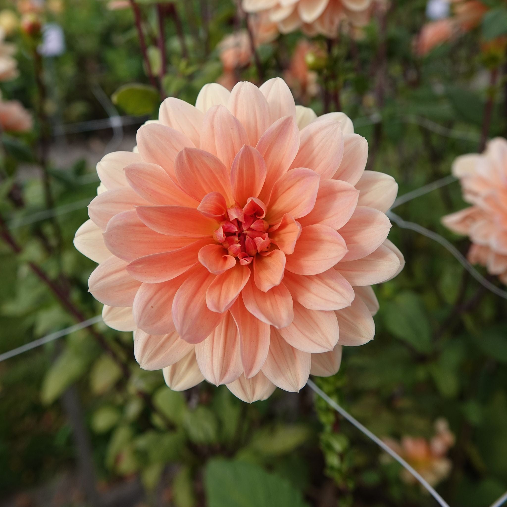 Die Dahlie ‘Yvonne’ ist meine neue Lieblingssorte. Ihre etwa 12 cm großen Blüten haben eine warme Farbpalette, die während der Blüte von einem warmen Apricot-Ton zu einem zarten Lachsrosa übergeht. Die breiten, flachen Blütenblätter verleihen ihr die typische Seerosenform, bei der man direkt in das Herz der Blüte blicken kann. Durch die schöne Blütenform ragen die Blüten über die Blätter hinaus, was ich an ihr am schönsten finde.