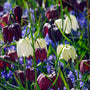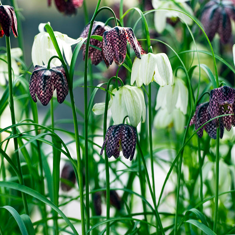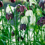 Fritillaria Meleagris, auch Schachbrettblume genannt. Weiße und kastanienbraune, glockenförmige, hängende Blüten mit Schlangenhautmuster. Eine schöne Zwiebelpflanze mit schmalen Blättern und einjährigem Wuchs. Ab 20 Stück: 4,90 € pro Packung.