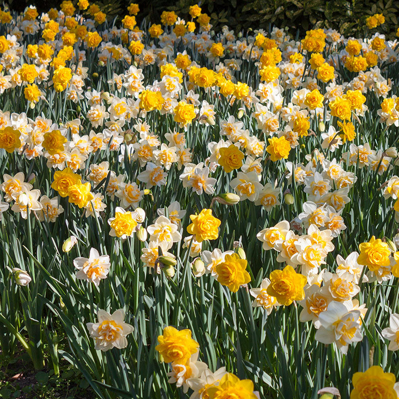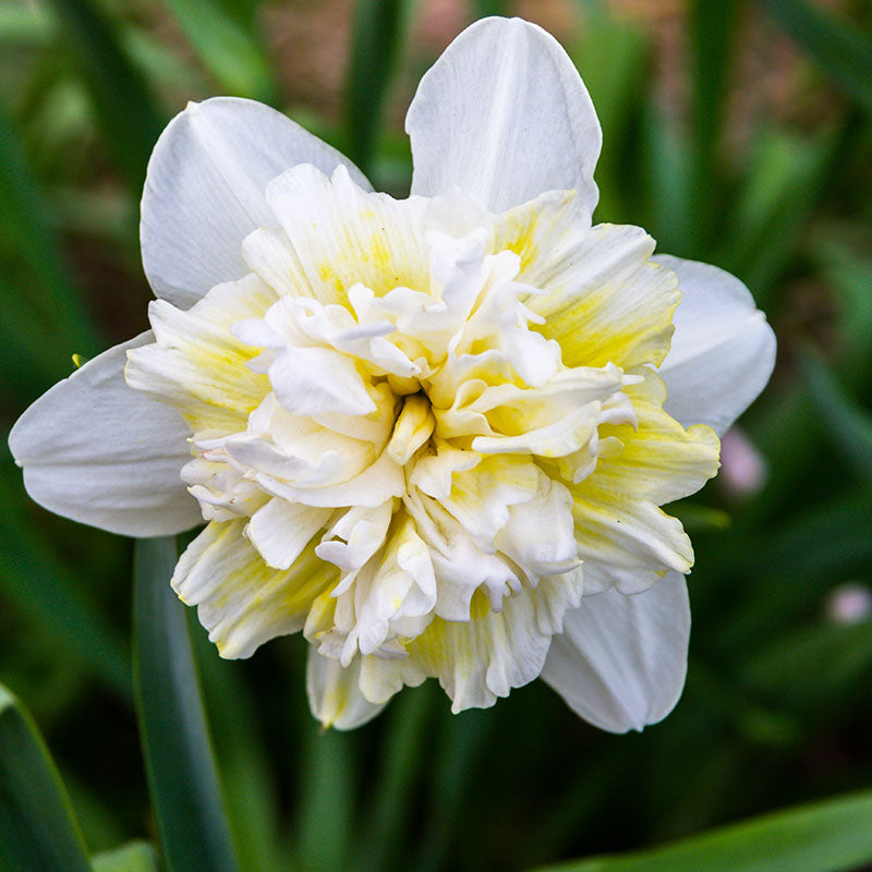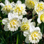 Narcissus Ice King ist eine gefüllte Narzisse mit cremeweißen Blütenblättern, die von gerüschten zitronengelben Schichten durchsetzt sind. Die Blütenblätter werden während der Blüte zunehmend heller und werden von leuchtend grünen Blättern begleitet. Ab 20 Stück: 8,00 € pro Packung