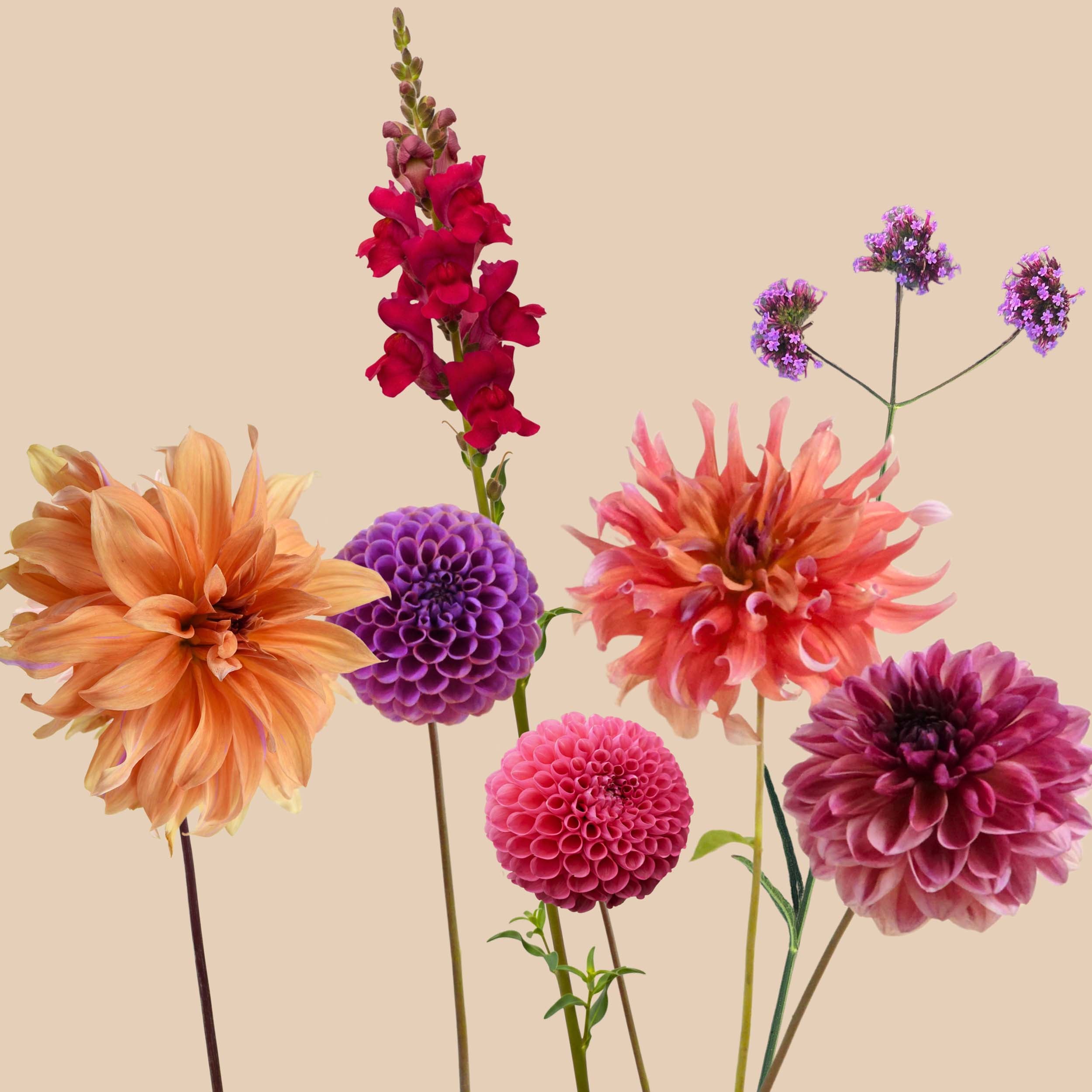 Dahlienknollen und Blumensamen (in dieser Farbpalette)