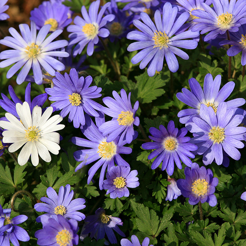 Anemone blanda Blue Shades verzorgd in het voorjaar een bloementapijt met honderden kleine sterachtige bloemen in verschillende blauwtonen. Afwisselende kleuren van hemelsblauw tot diep blauw met als contrast een geel hartje. Vanaf 3 stuks: € 4,90 per verpakking