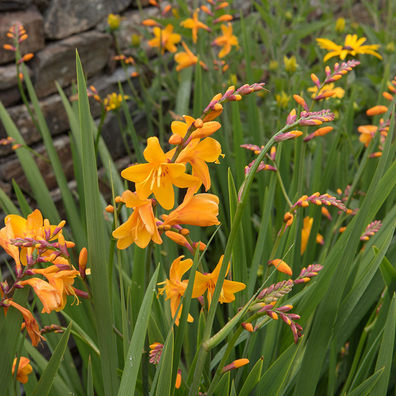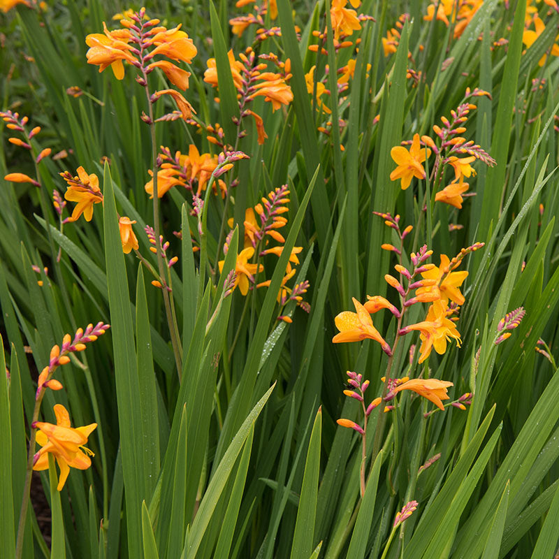 Crocosmia oftewel Montbretia is een echte blikvanger voor in de zomertuin. Een verzameling van kleine oranje bloemen die omhoog worden gehouden aan een lange iets wat gebogen steel met daar tussen zwaardachtige bladeren.
