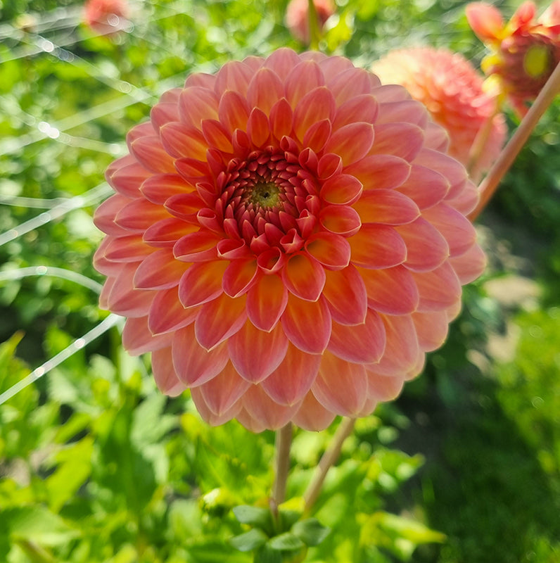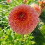 Dahlia ‘Hillcrest Suffusion’ heeft een kleur die je niet onder één kleuromschrijving kan vangen. Haar balvormige bloemen zijn gekleurd in een mix van mango, koraal en perzik tinten, met een helder geel hart. Soms neigt ze wat meer naar roze, waardoor je de hele zomer weer een andere tint ontdekt. Met een bloemdiameter van zo’n 12 cm en een hoogte van ongeveer 100 cm past ze perfect middenin de border, maar ook in een grote pot doet ze het goed.
