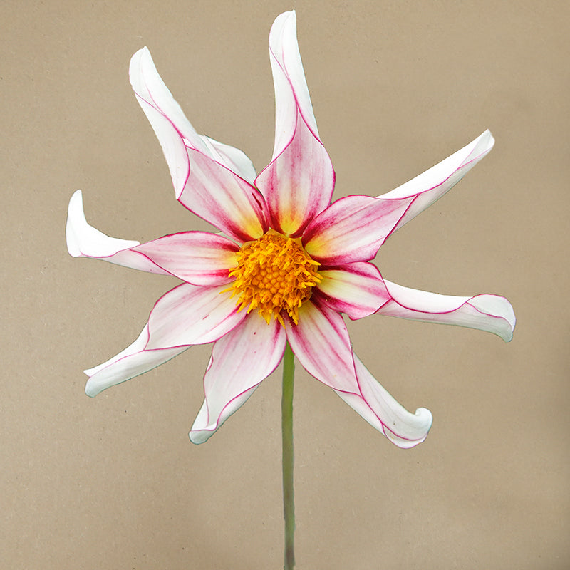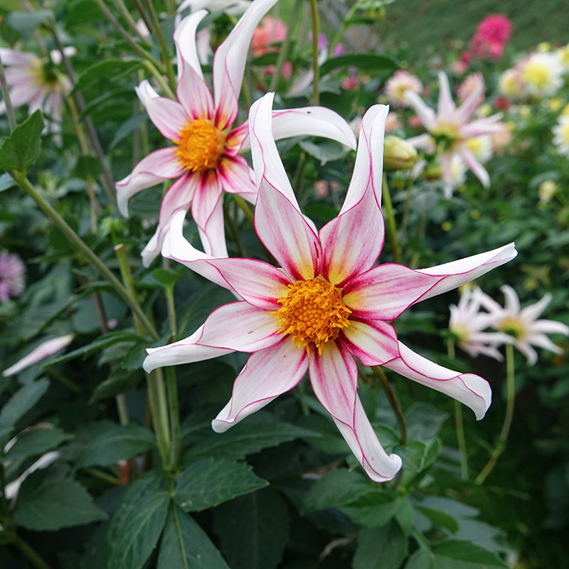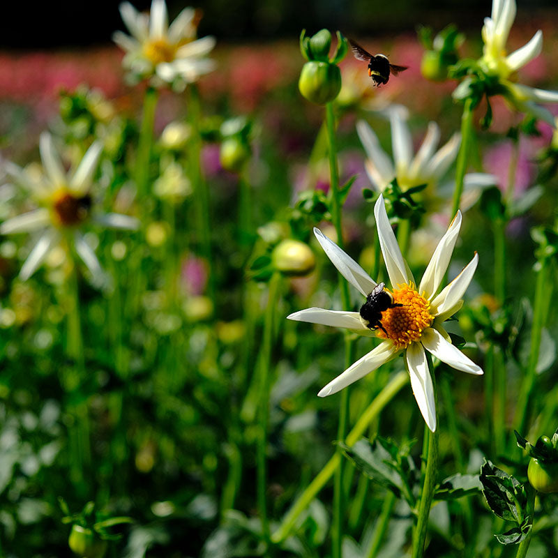 Dahlia ‘Honka Fragile’ is een van mijn favoriete dahlia’s, ze straalt als een ster in je tuin. Super subtiel en eenvoudig en dat maakt haar juist zo mooi. Haar smalle witte bloemblaadjes zijn licht gevouwen en hebben een zachtroze randje. In het hart straalt een goudgeel hart vol met nectar, waardoor de bloemen volop gezoem van hommels en bijen aantrekt. Een waardevolle en elegante toevoeging aan je tuin.