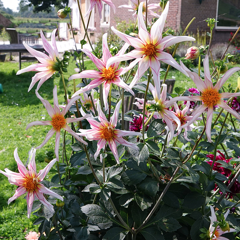 Dahlia ‘Honka Fragile’ bloeit van de zomer tot de eerste vorst met stervormige bloemen van ongeveer 10 cm groot. De planten worden zo’n 100 cm hoog en produceren volop bloemen die stevig op hun stelen staan. Ze trekken niet alleen de aandacht door hun bijzondere vorm, maar ook door de overvloed aan stuifmeel. Je zult er regelmatig bijen, vlinders en slapende hommels in aantreffen.