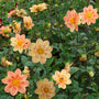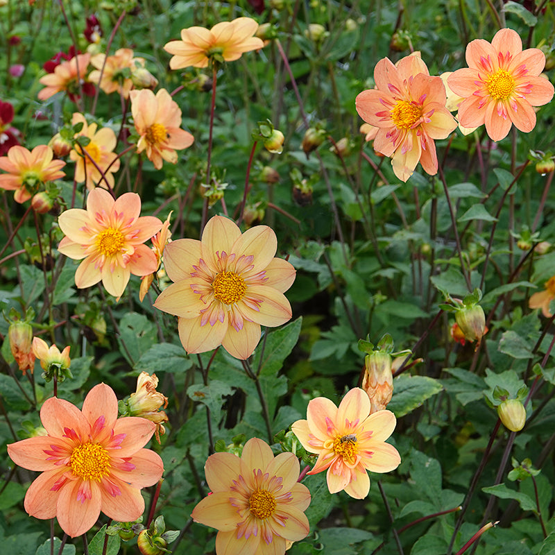 Dahlia ‘Kelsey Annie Joy’ is een zonnige en levendige toevoeging voor jou en de natuur. Haar enkelbloemige bloemen zijn ongeveer 10 cm groot en hebben een warm kleurenpalet van zacht perzik en geel, met hier en daar een vleugje roze. In het midden schittert een kroon vol nectar, waardoor bijen en vlinders niet weg te slaan zijn.