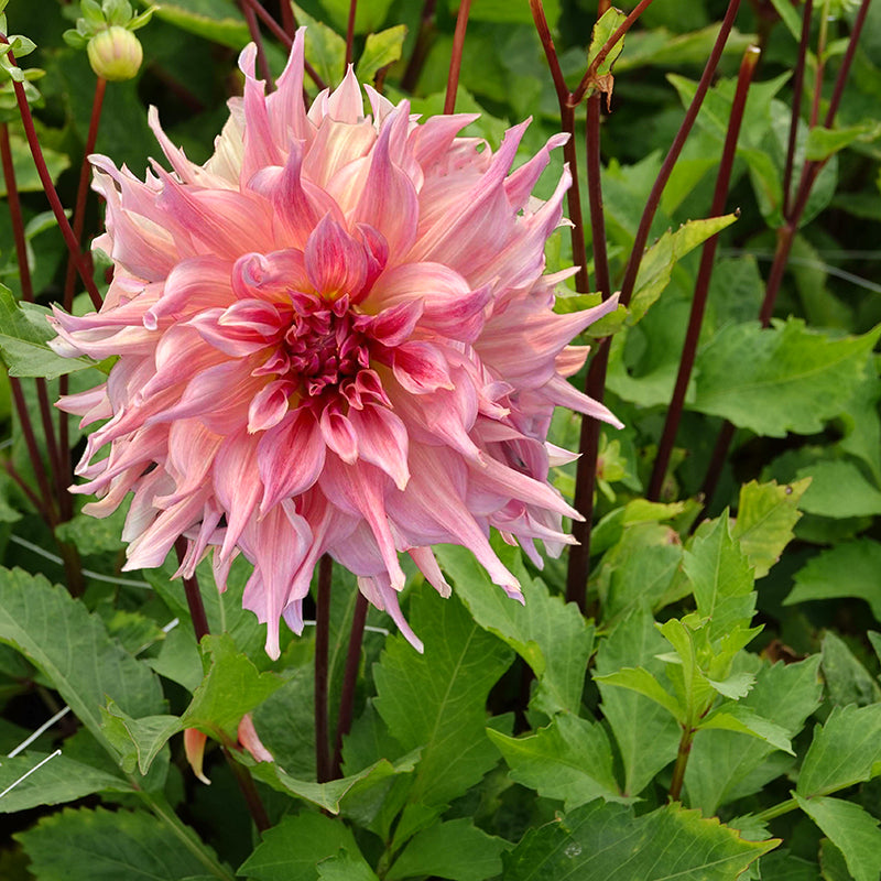 Dahlia ‘Penhill Watermelon’ is denk ik wel de grootste dahlia bloem die ik tot nu toe in de tuin heb gehad. Deze dinnerplate dahlia heeft bloemen van 25 a 28cm doorsnee. Haar licht gekrulde bloemblaadjes laten een afwisselend kleurenspel zien van roze, abrikoos, lavendel en een vleugje geel. Daarmee is ze heel mooi te combineren met heel veel andere dahlia’s.