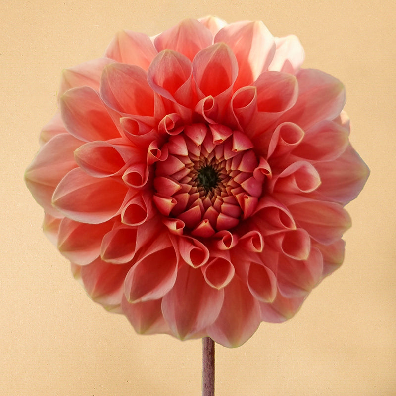 Dahlia ‘Romance’ voelt als een liefdesbrief in bloemvorm. Haar kleur wisselt tussen mijn favoriete kleurtinten van zalmroze en perzik. Haar middelgrote bloemen van zo’n 15cm zijn super mooi gevormd, alsof elke bloemblaadje is opgerold en met een pincet op het bloemetje is geplaatst. De bloemen worden hooggehouden op sterke lange bloemstelen wat haar ook nog eens een perfecte snijbloem maakt.