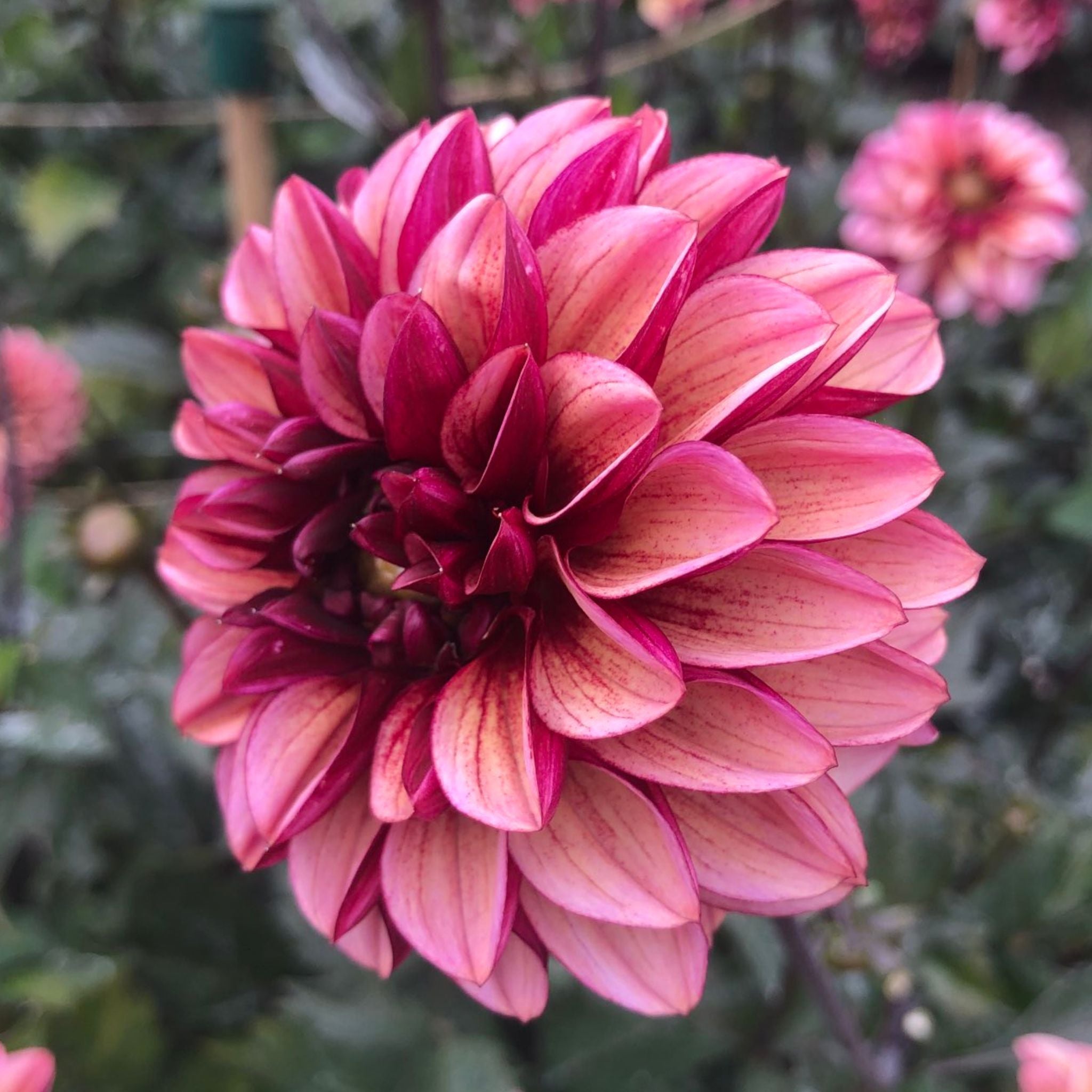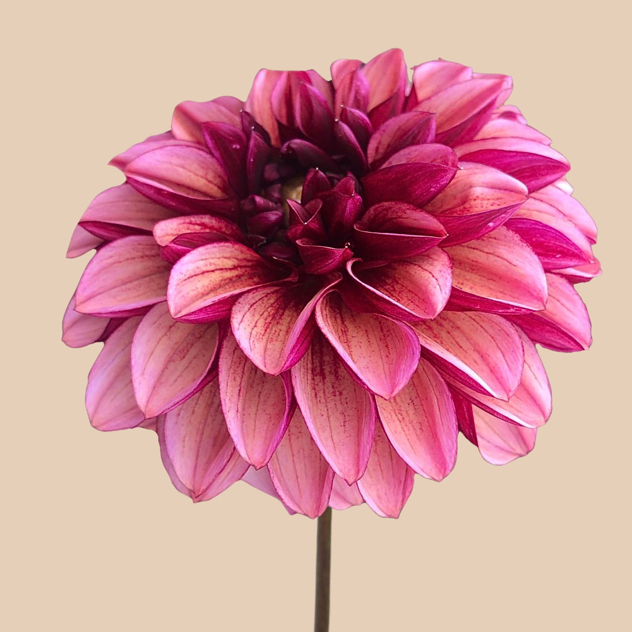 Dahlia ‘Senior’s Hope’ heeft haar naam niet echt mee, laat je hierdoor niet misleiden want het kleurenpalet is magisch. Van een afstand lijkt ze aubergine paars, maar van dichtbij zie je dat elke bloem een gemixt kleurenpalet heeft van: mauve, framboosrood, een vleug goud en een donkere frambozen wijn kleur op de achterkant van de bloemblaadjes. Dat gelaagde kleurenpalet geeft haar veel diepte en maakt dat geen bloem er precies hetzelfde uitziet.