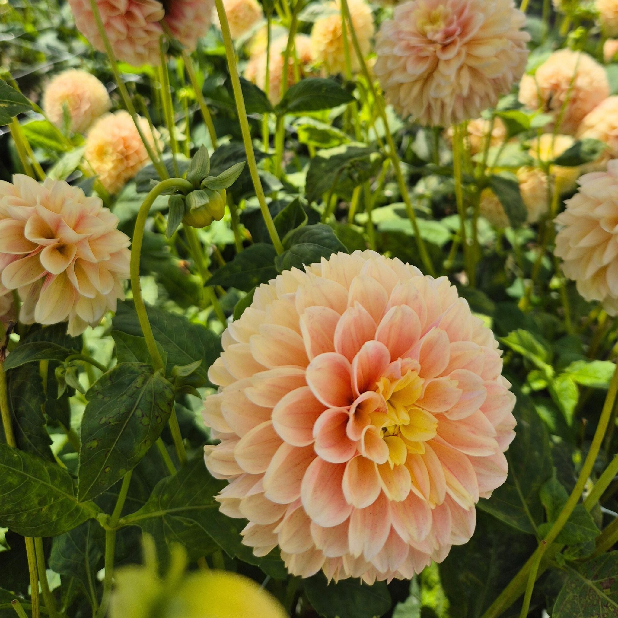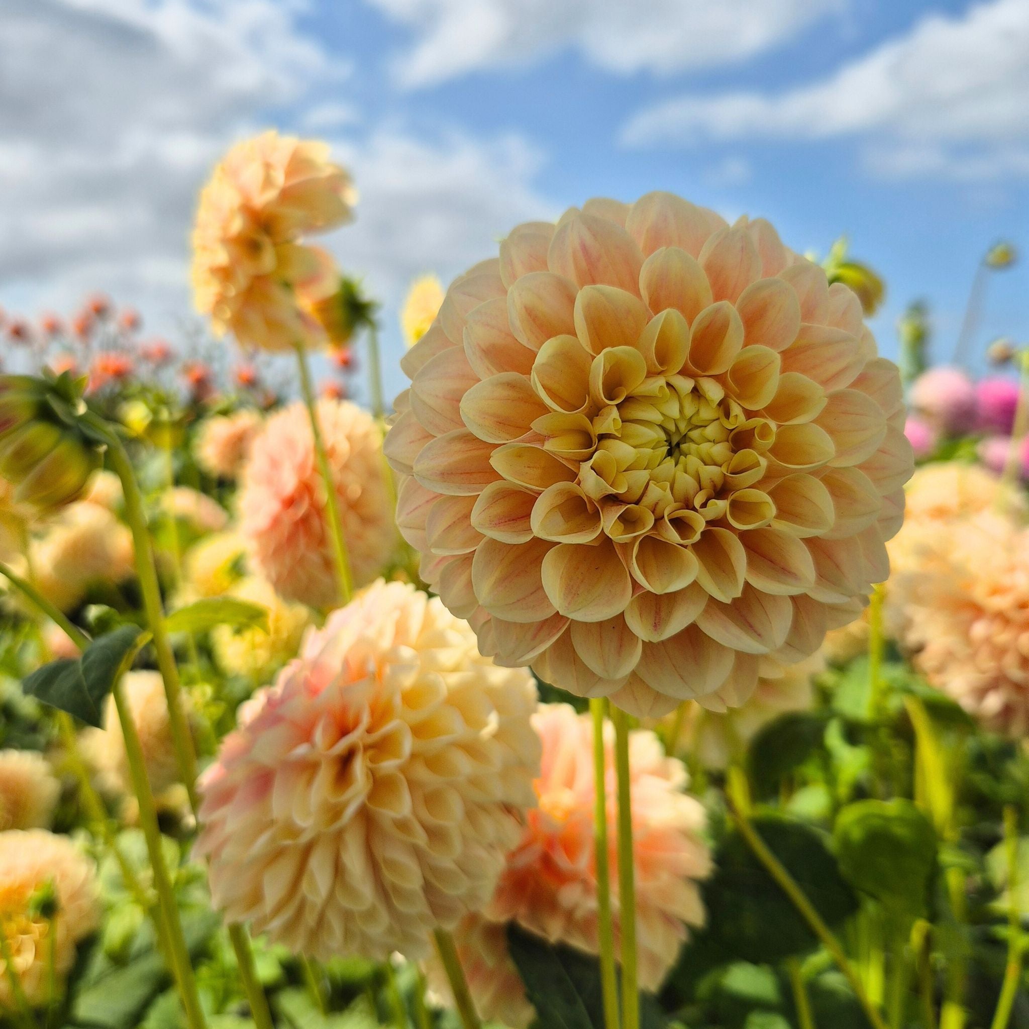 Dahlia ‘Sweet Suzanne’ heeft een heel mooi warm zomers kleurenpalet. Haar afgeronde bloemblaadjes hebben een zachte perzik-crème tint, die richting het hart overloopt naar een romige crème gele kleur. Het subtiele kleurenspel in combinatie met de mooie ronde pompon vormige bloemen maken haar een mooie toevoeging en een perfecte basis om met andere pastelkleurige dahlia’s te combineren.