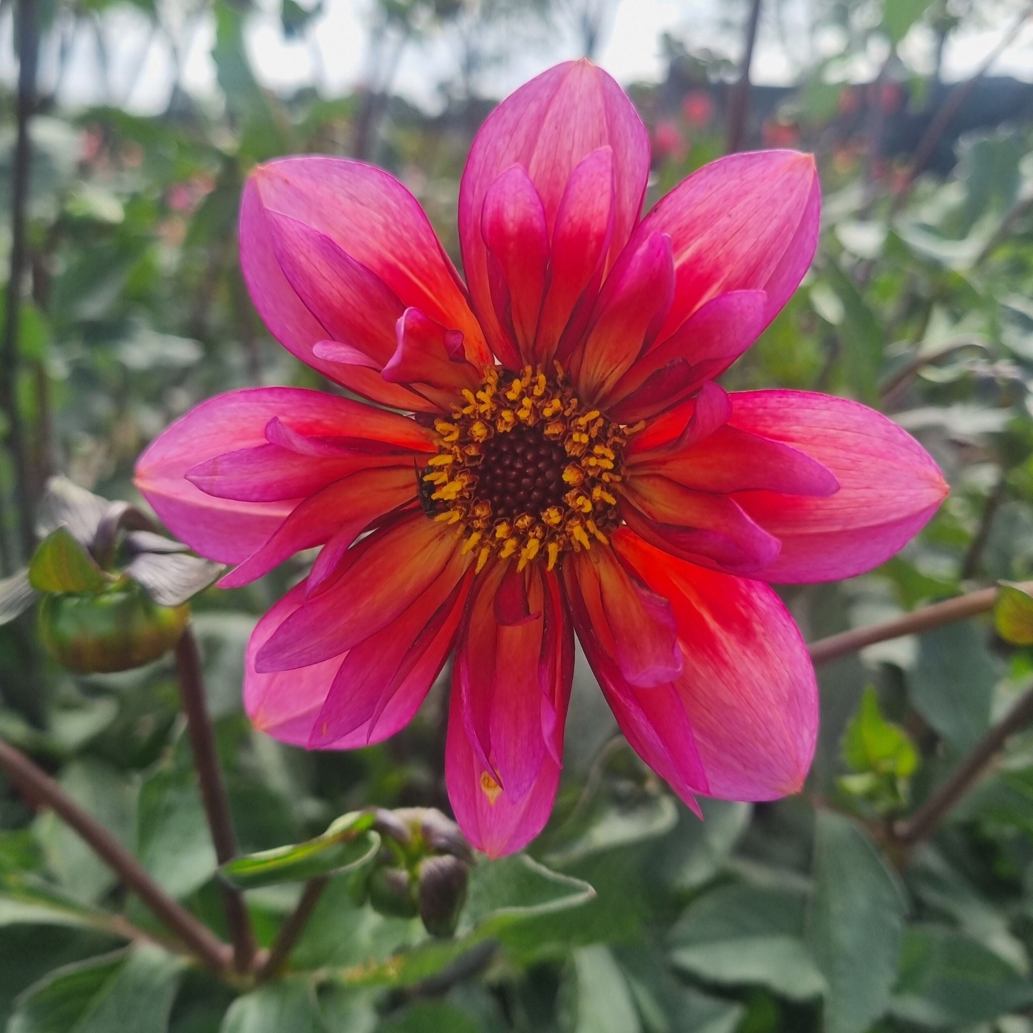 Dahlia 'Princess Nadine' has a name that sounds like it's straight out of a Disney fairy tale. In my opinion, this matches the fairytale-like warm colors of this flower. Its 12cm flowers are a warm apricot pink, developing a purple-fuchsia hue as they mature. The open yellow center is filled with nectar, so you'll attract butterflies, bees, and buzzing bumblebees all summer long.