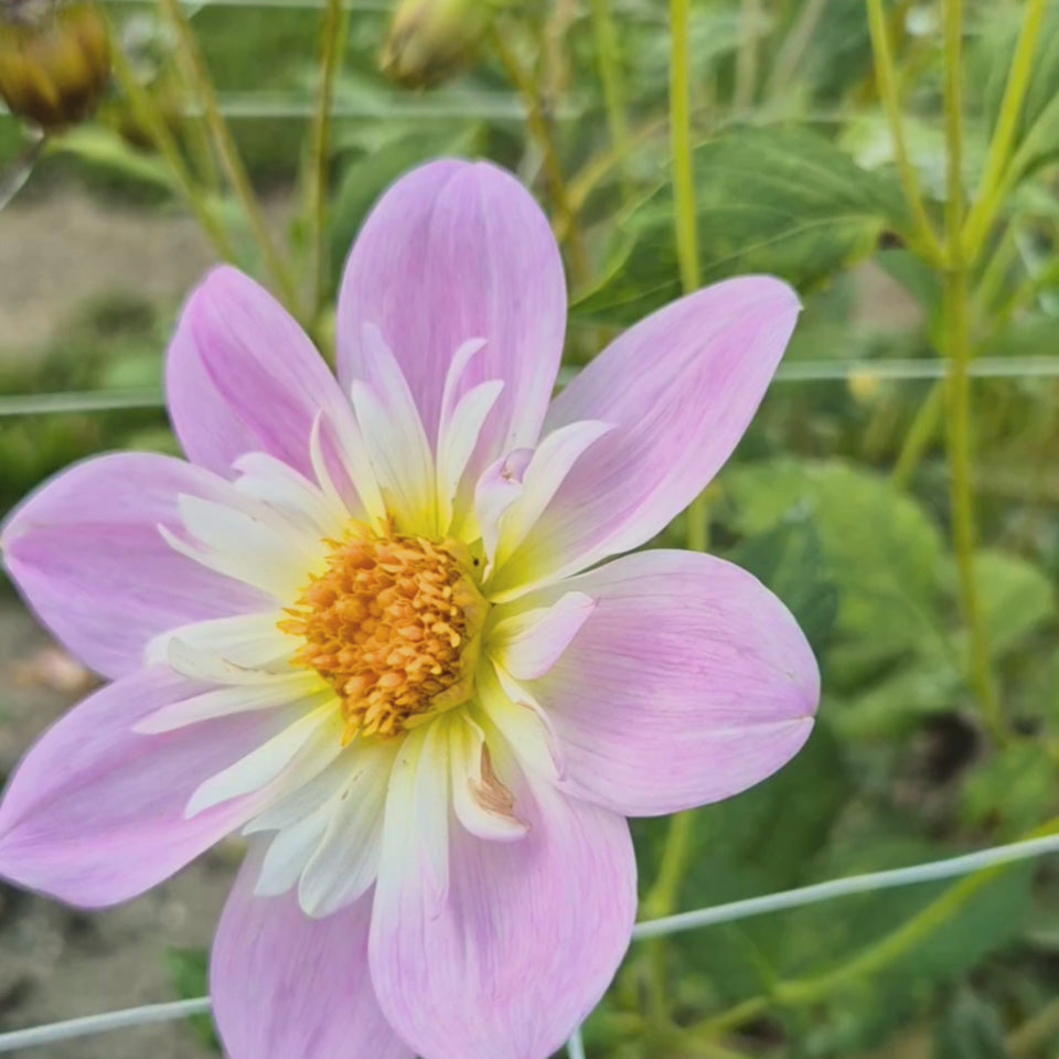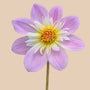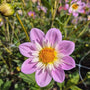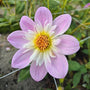Dahlia 'Teesbrooke Audrey' has a very soft, delicate appearance. Its soft pastel pink petals frame an ivory white collar, and in the centre radiates a warm yellow heart.